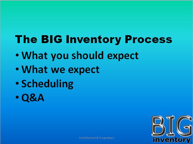 BIG Inventory will send out the proper logon information for this online presentation. It is recommended each participant is located at their own computer and calls in independently.